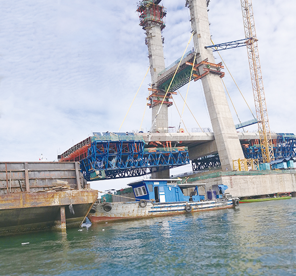 肯達(dá)里斜拉橋位于印尼蘇拉威西省,橋梁全長(zhǎng)474.08m,主跨388m,雙塔高約78.35m,預(yù)應(yīng)力混凝土橋面寬25m,采用雙向雙車道公路和兩條人行道。